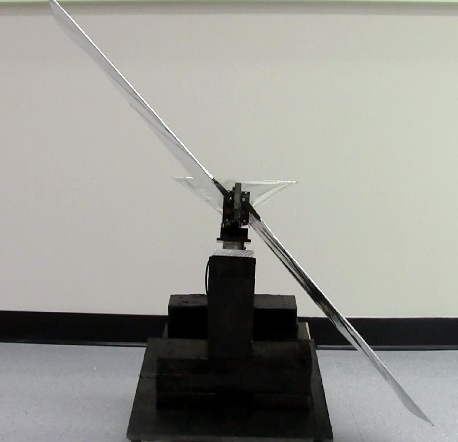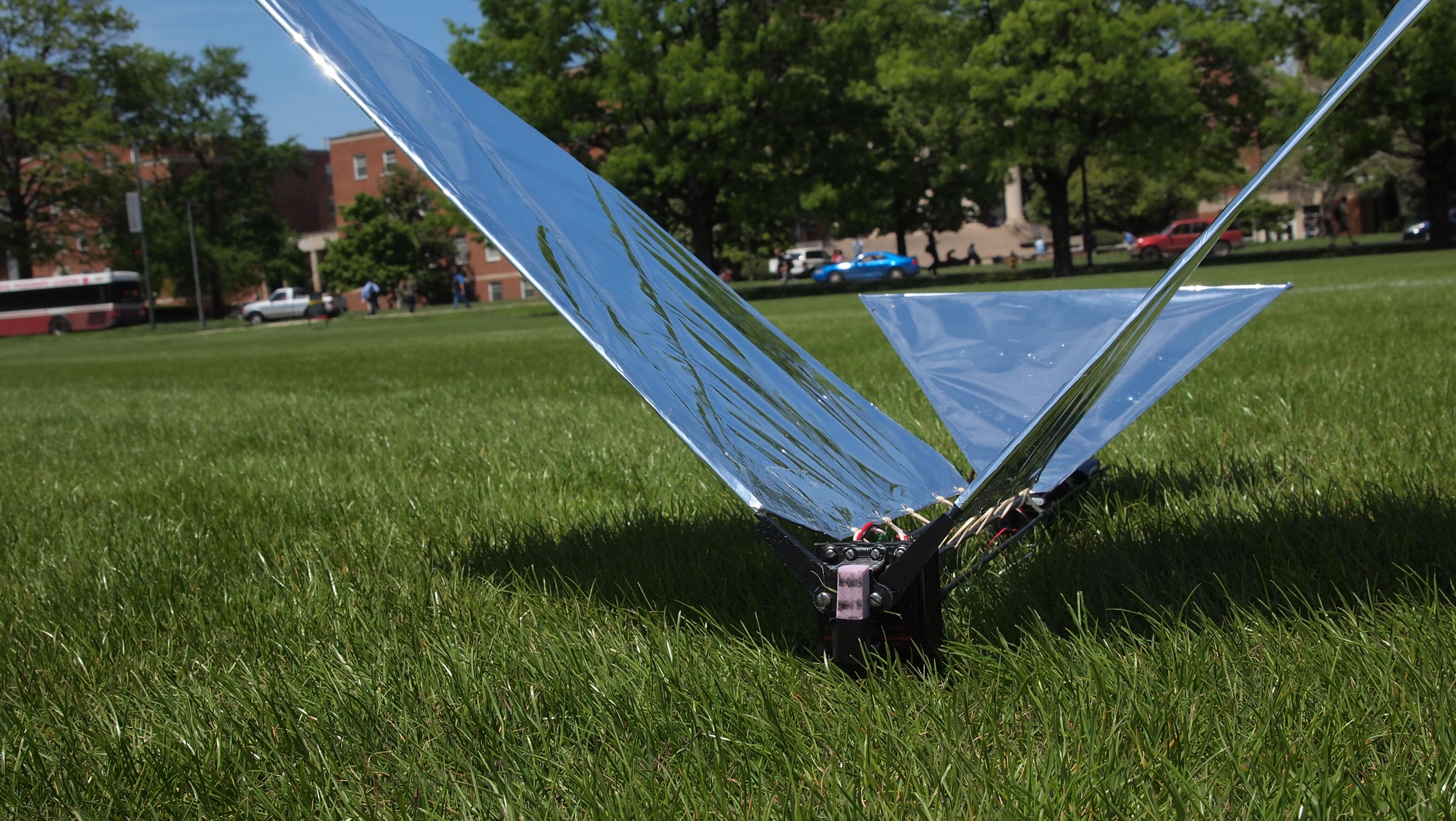 This has been an incredibly difficult problem to solve because controlling each wing separately requires two motors and a larger LiPo battery which, in the past, have made robotic birds too heavy to fly. Gupta’s group used new manufacturing technology like laser cutting and 3D printing to create lightweight and geometrically complex Delrin™ and ULTEM (high quality lightweight nylon) parts for the bird’s body. The bird has an onboard Arduino™ microcontroller used to program wing motions which can be either coupled or completely separate, allowing programmable wing motion profiles to ensure the wings maintain the right speed to generate the right balance between lift and thrust forces. These forces are measured using a custom built test stand with a 6 degree of freedom load cell to measure the forces and torques acting on the bird simultaneously. The team also performed system level optimization to make sure all the components worked well as an integrated system. Each of these aspects were key in making Robo Raven light enough to fly.